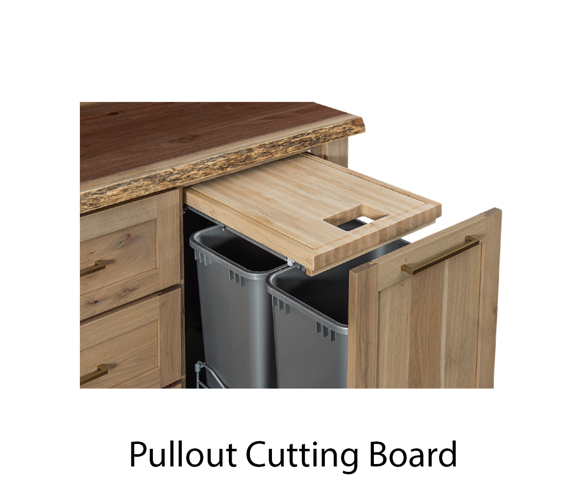 • Pullout cutting board above trash can drawer